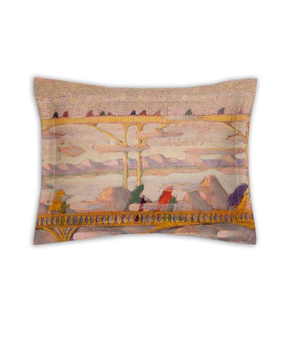 DecoFlux design team immersed themselves in the art world of Čiurlionis to create something special that would not only honor his legacy but also enrich today’s interior design. This pillow cover design reflects the delicacy and spiritual depth of Čiurlionis’ Angel Prelude painting. Softly combined colors create a mystical harmony reminiscent of the light of angel wings and the dawn of the world. Each line here symbolizes an unearthly harmony, and the dance of colors represents that silent melody that only the soul seems to hear. The pillow cover is sewn from two designs “Angel Prelude” and “Reflection” to reveal the inner world of a person. M.K. Čiurlionis’ work crossed national borders and became a global phenomenon. His works were exhibited in prestigious galleries and museums, and his music was played in the most important concert halls. His ability to synthesize sound and image into a unique art form continues to fascinate art critics and art lovers around the world.